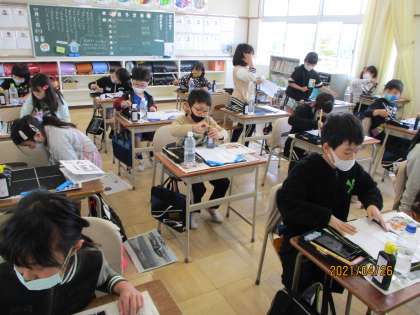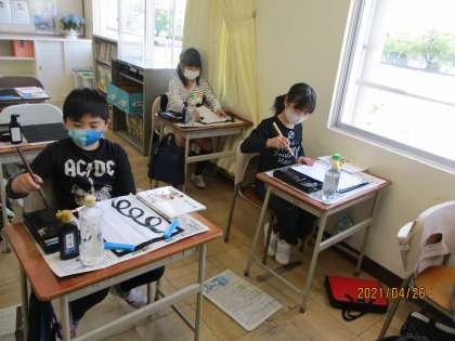 今日の書写では初めて筆に墨をつけて半紙に書いてみました。初めて習字を行った子も多く、戸惑っていました。次回から本格的に文字を書き始めます。