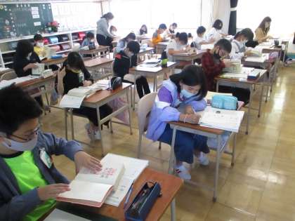 5年生の国語では、漢字の「へん」と「つくり」の成り立ちについて漢字辞典を使って調べました。音を表す部分と意味を表す部分からできていることも分かりました。これからも興味をもった漢字について調べていきましょう。