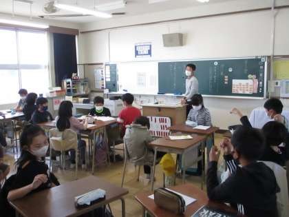 6年生の国語では、「帰り道」の個人の感想をグループで読み合いました。そして、付箋を使って意見を交換しました。最後に、グループの代表の子が、まとめとして気づいたことや付箋を読んで感じたことを発表しました。自分の考えを仲間の考えをもとに深めていくことはこれからも大切にしてください。