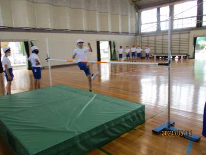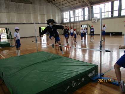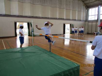 体育では、走り高跳びの学習をしています。歩数や足の上げ方に意識して取り組んでいます。自分で目標を決めて、練習をしています。友達の跳び方を見て学んだり、アドバイスをしたりして、どんどん上達しています。