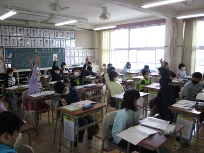 6年生の算数では、文字を使って表された式の意味を考えました。XやYの他に、a、b、c、dなどの文字を使い、平行四辺形や台形の面積を文字を使って表し、子どもたちが説明をしました。しっかり説明ができた子には自然に拍手がおこり、すばらしいと思いました。