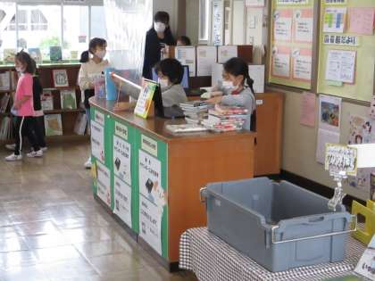 昼放課に各学年、たくさんの子が本を借りに来ました。図書委員の子たちは、返却と貸出の仕事でたいへん忙しくなりました。時間をみつけていっぱい本を読んでみましょう。