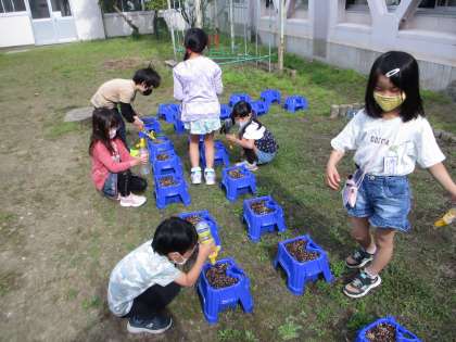 あさがおの水やりをやっていると、「先生、芽がでたよ。見て、見て。」うれしそうな声が聞こえました。心を込めてこれからも大切に育てましょう。