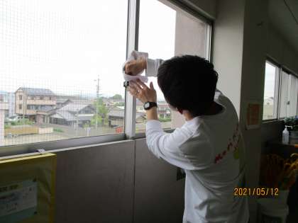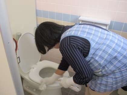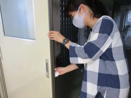 子どもたちが下校した後、トイレの清掃やよく触れるところの消毒をしています。