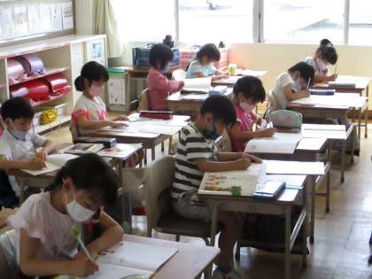 2年生の書写は、硬筆で書写ノートを書きました。ます目の中の書くところに気をつけて、いい姿勢で書くことができました。