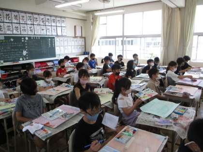 4年生の図工では、「遠いところから色をつけていこう」というめあてで、バックと机の順にそれぞれの教えてもらったぬり方で色をつけていきました。しっかり話を聞いてていねいにぬることができました。