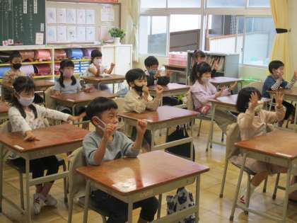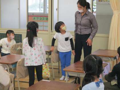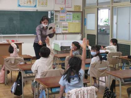 2組は、初めての英語活動がありました。名前と色の言い方を教えてもらいました。音楽に合わせて手遊びをしたり、教室にある色を探したりして、楽しく英語を学ぶことができました。1組の英語活動は明日です。