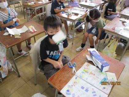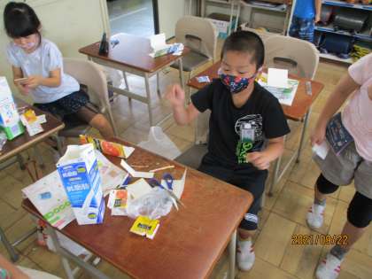 きょうは、クラスみんなで『パッチンジャンプ』を作りました。牛乳パックの大きさを工夫して切ったり、牛乳パックにかけるゴムの数を変えてみたりしながら、よくはねるパッチンジャンプを作ることができました。