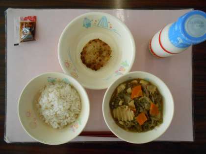 今日の献立は、麦ごはん、牛乳、すきやき、キャベツ入りつくね、お好みソースです。