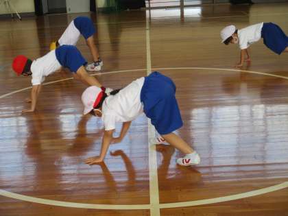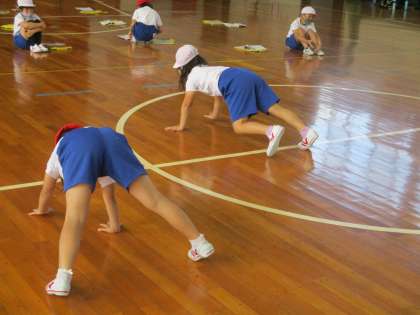 体育では、マット運動の練習が始まります。動物の動きを真似して歩いたり、体を動かしたりしながら運動を行っています。一生延命取り組んでいる姿が素敵です。