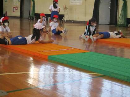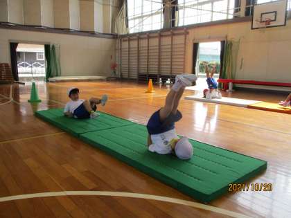 運動会が終わって、体育はマット運動になりました。丸太まわり、ゆりかご、アンテナなどいろいろなマット遊びを行いました。