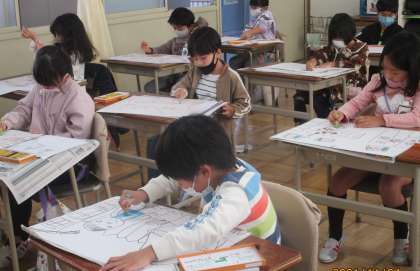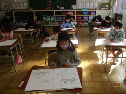 「おはなしから うまれたよ」の学習で、お話を聞いて心に残った場面を絵にしました。みんな真剣な表情で絵を描いていました。