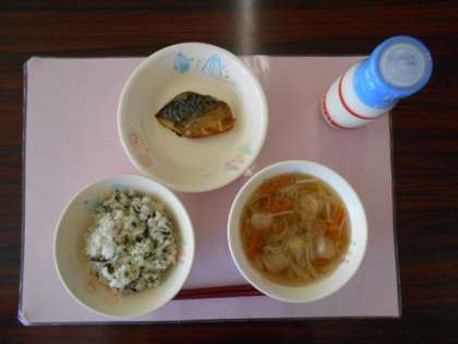 今日の献立は、ごはん、牛乳、鶏団子汁、さばの塩焼きです。