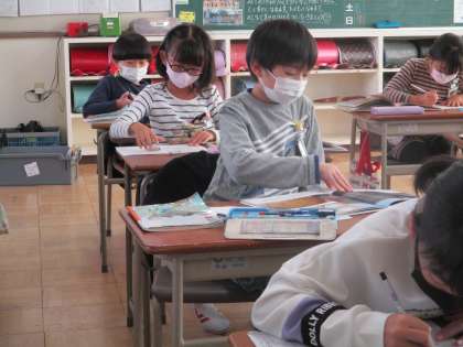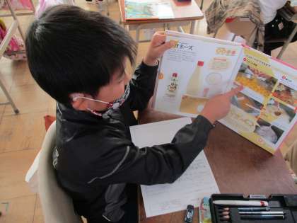 今日は、「食べ物のひみつを教えよう」で紹介したい食べ物を決め、本を読みながらメモをとりました。すがたをかえる食品について、どのように作るかをメモしました。書籍を活用し、どの子も真剣に調べていました。