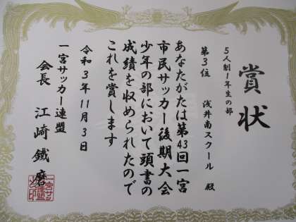 第43回一宮市民サッカー後期大会少年の部 5人制1年生の部で第3位になりました。