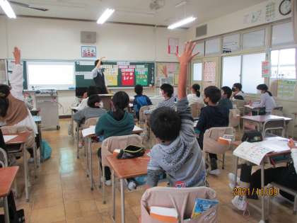 今日の給食の食材が3つのグループのどこに入るかを考えたり、健康寿命についての話を聞いたりしました。