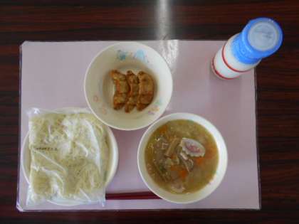 今日の献立は、中華めん、牛乳、和風豚骨ラーメン、揚げギョーザです。