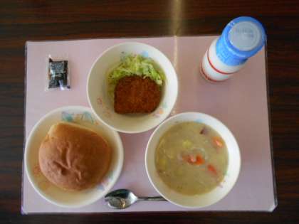今日の献立は、サンドイッチバンズパン、牛乳、さつまいものポタージュ、白身魚のポーションフライ、ボイルキャベツ、とんかつソースです。