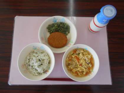 今日の献立は、わかめごはん、牛乳、かきたま汁、ポテトコロッケ、いんげんのごま和えです。