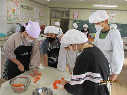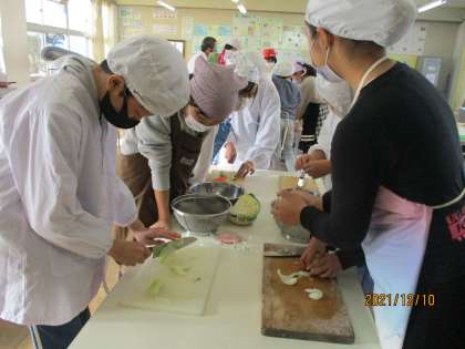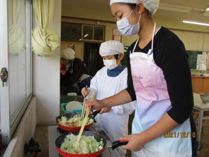 調理実習の様子です。グループの友達と協力して、野菜炒めを作ることができました。分担をしながら楽しそうに作る様子が印象的でした。