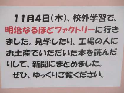 今日から3日間、保護者会になります。担任一同、保護者の皆様とお話ができることを楽しみにしております。廊下には、校外学習の後に書いた、子どもたち全員の新聞が掲示してあります。ぜひ、お子様の新聞をご覧になって、帰ってください。