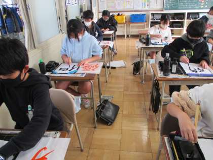 今年最初の書写は、今年の意気込み(目標)を漢字一文字で表して書きました。最後に、冬休みに作った消しゴムはんこを押して完成させました。文字の力強さからやる気が伝わってきます。公開の折に見てください。