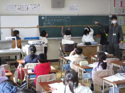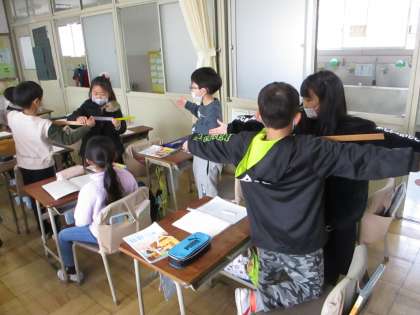 2年生の算数では、長いものさしを使って、両手を広げた長さをはかりました。となりの子とペアになって、100cmをこえる長さを頑張ってはかりました。意欲的に行うことができました。