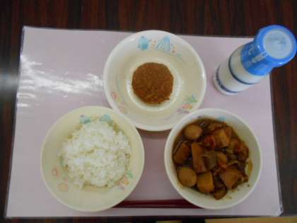 今日の献立は、ごはん、牛乳、みそおでん、和風コロッケです。