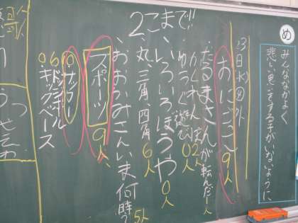 今日は、クラスのみんなで、お楽しみ会で何をやるのかを考えました。学級委員を中心に決めました。悲しい思いをする子がいないように、みんなで楽しく遊ぶことを第一に考え、計画を立てることができました。