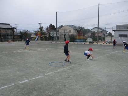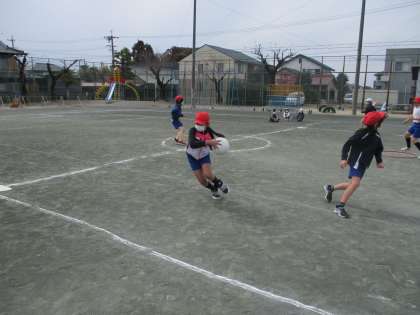 3年生最後の体育では、キックベースボールをしています。ボールを蹴ったり、守ったりして、思いっきり体を動かしました。