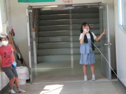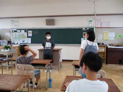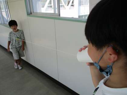 理科の実験で糸電話を作って試して遊びました。10メートルほどの長さの糸から伝わる音の響きにびっくりしました。朝の会では、堂々とした司会ぶりです。