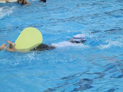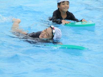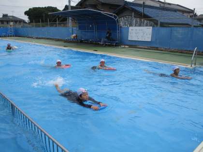 水泳の授業の後半では、高学年用プールと低学年用プールでバタ足や浮きの練習をしました。一生懸命、取り組んでいました。