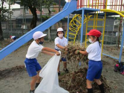 朝、除草作業を行いました。学年でごみ袋2袋をいっぱいにすることを目標に活動しました。3年生は、8袋いっぱいに草や落ち葉を集めることができました。短い時間でしたが、一生懸命に取り組む姿が見られました。自分たちの学校を自分たちできれいにしようと、友達と協力して頑張りました。