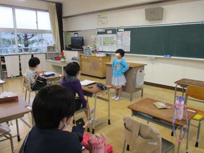 スピーチでは、分かりやすく伝わりやすい内容を心がけています。質問も的確な内容です。しっかり話を聞けるようになってきています。給食タイムは楽しみな時間です。