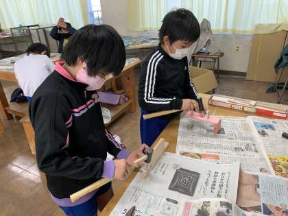 図工の学習では、のこぎりを使って木工の作品を作っています。4年生にとって、のこぎりは初めて扱う道具です。けがをしないように気を付けながら、ステキな作品に仕上げられるようにがんばっています。