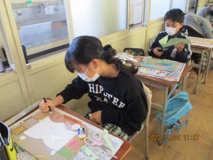 図工の授業では、伝言板に色を塗ったり、シール状になっているホワイトボードを張ったりして、仕上げをしました。一人一人思いのこもった素敵な伝言板になりました。