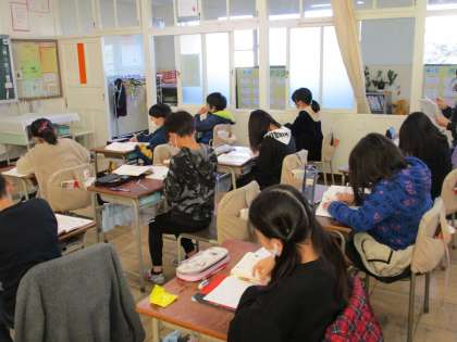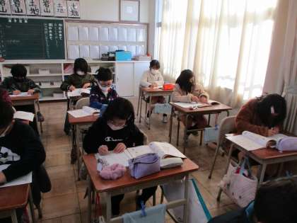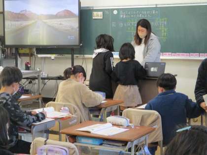 4年生の算数では、小数の割り算の筆算を学習しています。正解していると、先生に丸をつけてもらえます。どの子も全問正解目指して、黙々と問題を解いていました。頑張る姿勢がすばらしいです!