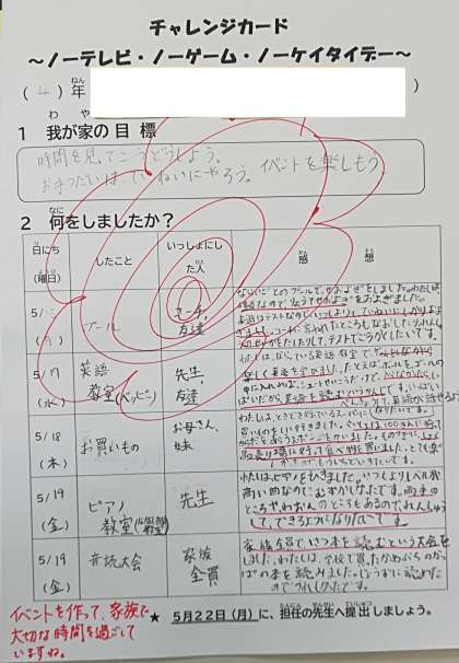 チャレンジカード(ノーテレビ・ノーゲーム・ノーケイタイデー)の取り組みについて、ご協力をありがとうございました。