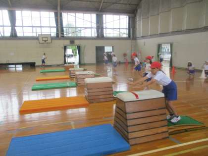今回は初回なので安全に跳び箱を用意したり、安全に学習するためにルールを確認したり、開脚とびで何段とぶことができるか確かめたりしました。みんなルールを守って安全に学習に取り組んでいました。