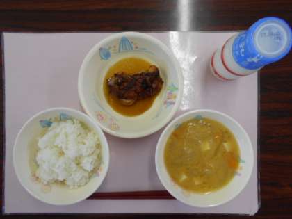 今日の献立は、ごはん、牛乳、てりどり、かぼちゃのみそ汁です。