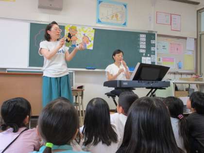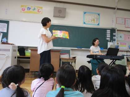 楽しい紙芝居や、面白い絵本を読み聞かせしてもらい、にっこにこの1年生でした。また、次回もよろしくお願いします。