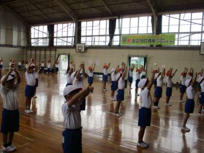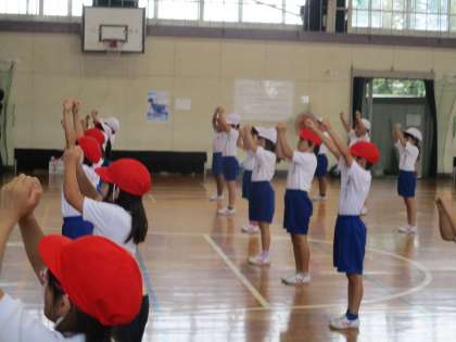 手をピンピンに伸ばしたり、膝を曲げてリズムをとったり…。ちょっと難しいところもありますが、みんな真剣に話を聞いて取り組んでいます。