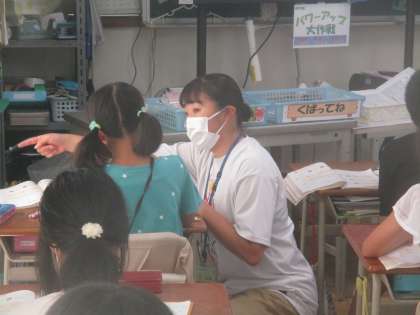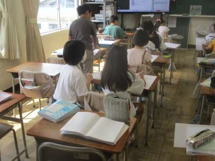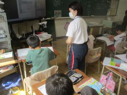 大学の授業の一環で、2名の大学生が小学校を訪れ、児童の学習の補助等の活動をしています。