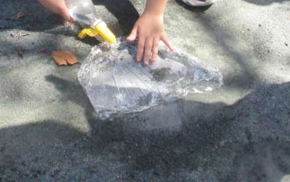 今日の理科は、運動場の砂場や遊具の周りなどでくぼんでいるところを探し、そこに水を流して水の流れる方向を調べる活動をしました。