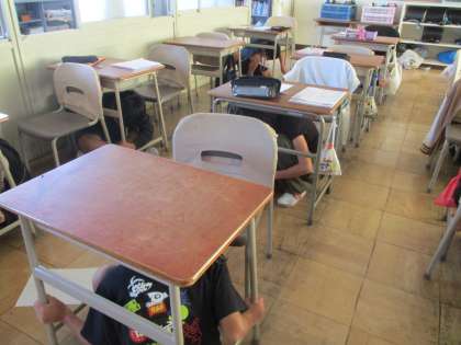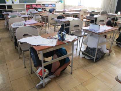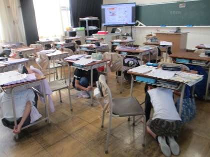 授業中、地震を想定した避難訓練が行われていました。いきなりの放送に驚くことなく黙って机の下にもぐり身を守ることができました。廊下に素早く並び人員点呼もできました。これまでの訓練がいきています。落ち着いた行動、真剣な様子に感心しました。