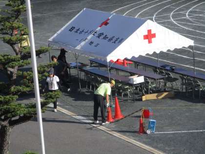 子どもたちが下校した後は、昨日に引き続き、教職員が運動会の準備を行いました。得点板の設置、放送機器の確認、運動場のトラックライン引き、児童席看板取り付け、カメラ席・保護者席・児童通路のライン引き、駐輪場の設置、案内表示設置、救護所準備等、協力して準備・確認をしました。
