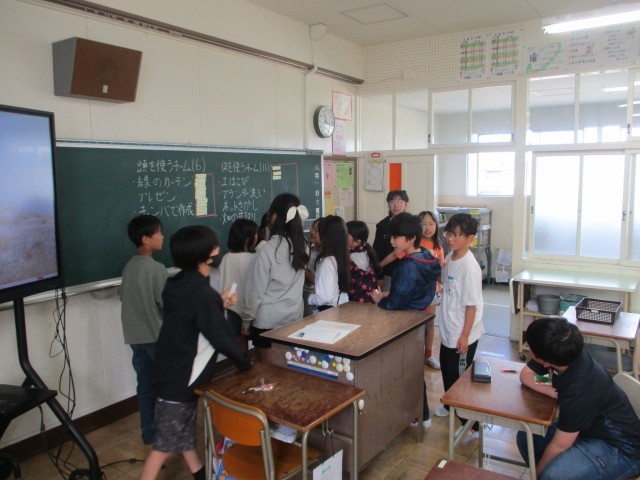 今日は、緑のカーテンをつける教室にプレゼンを行うチームと土運びなどの体を使うチームに分けました。