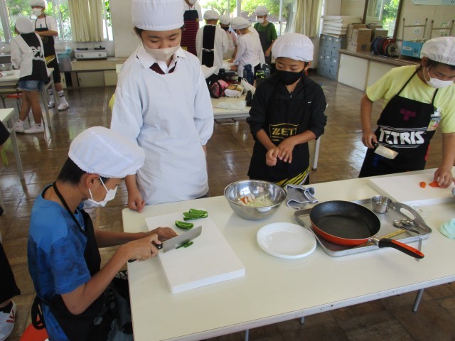 1・2時間目に野菜を切って、野菜炒めを作っていました。