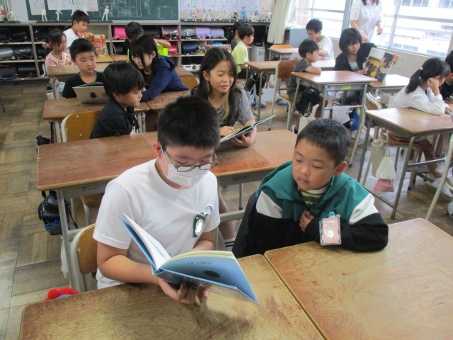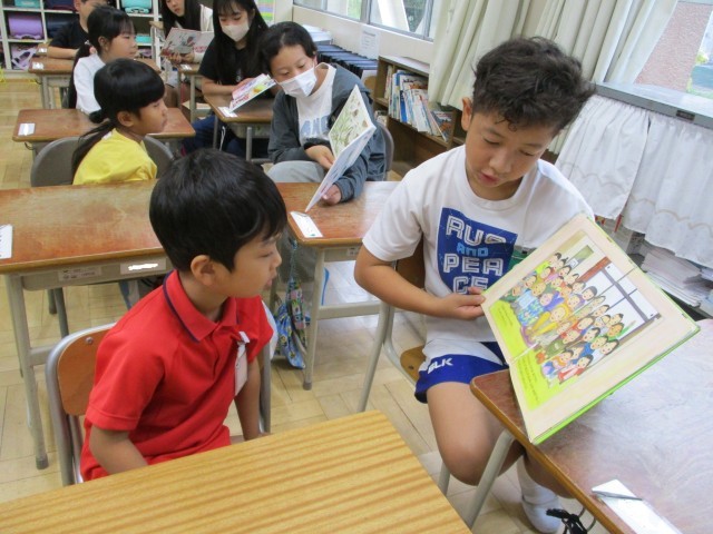 朝の読書の時間にペア読み聞かせを行いました。