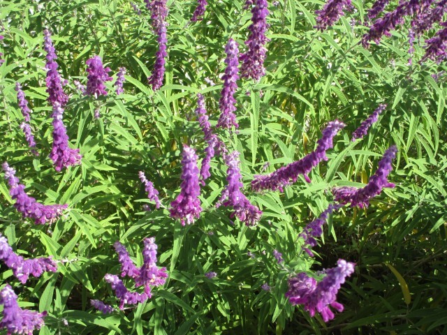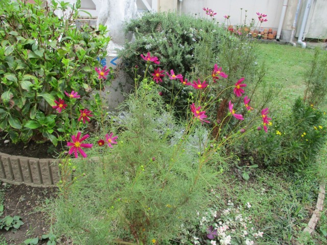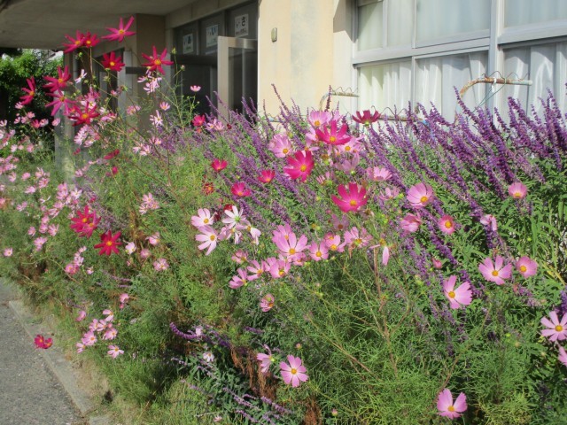 保健室前の花壇のコスモスとアメジストセージの花がきれいに咲いています。